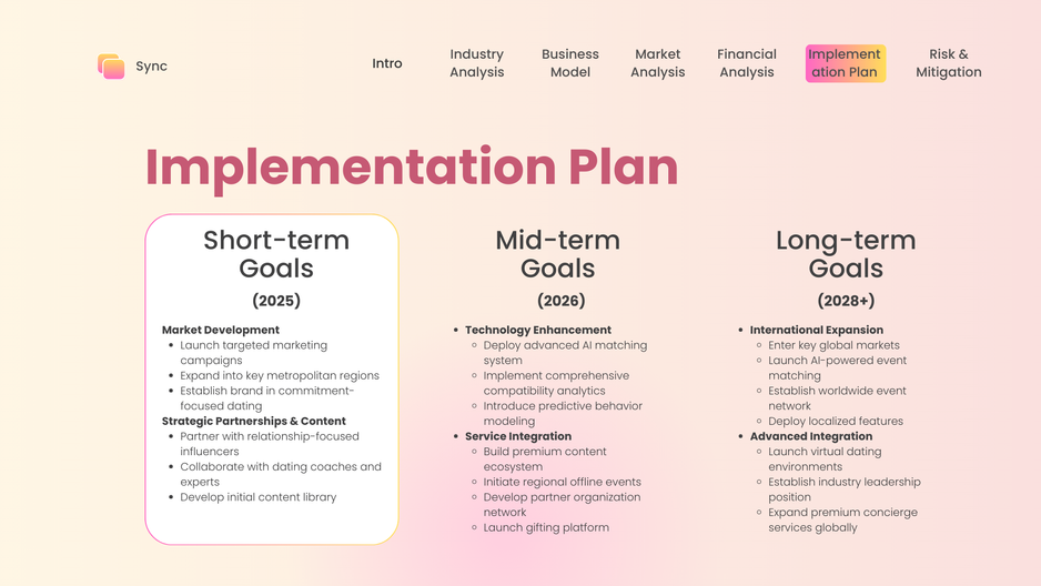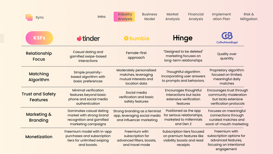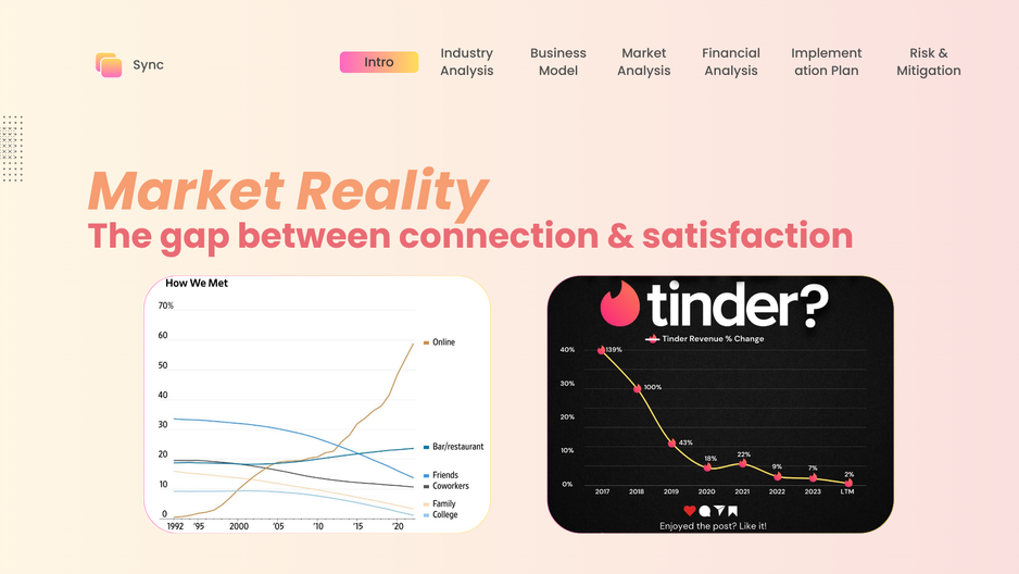 Sync is a commitment-focused dating platform designed to address societal gaps in the online dating landscape. Leveraging AI-driven matchmaking, verified reviews, and trust-based network effects, Sync fosters authentic and meaningful relationships. Unlike traditional dating apps that prioritize casual encounters, Sync provides a safe and reliable space for individuals seeking serious, long-term connections.